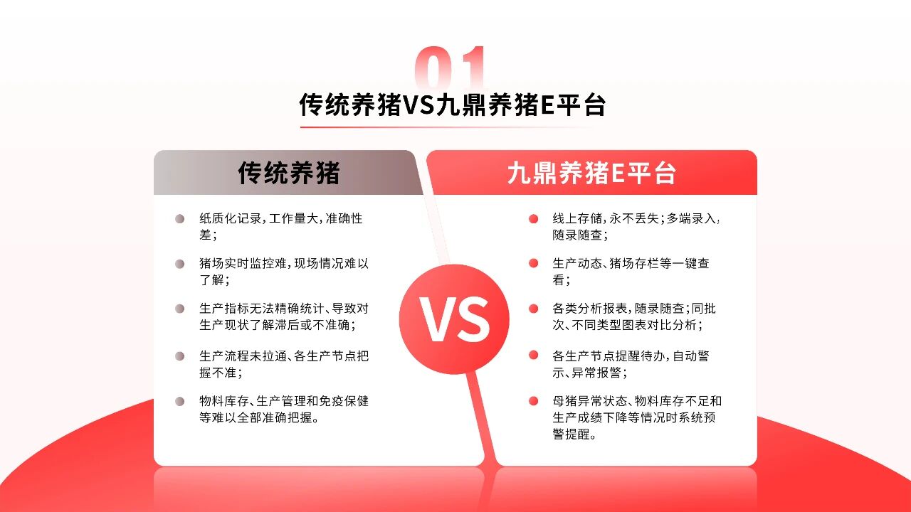 養(yǎng)豬E平臺是九鼎集團(tuán)專為規(guī)模豬場量身打造的專業(yè)數(shù)字化管理軟件。它深刻理解規(guī)模豬場的痛點和需求,通過精細(xì)的數(shù)據(jù)管理,讓養(yǎng)殖從靠經(jīng)驗變?yōu)榭繑?shù)據(jù),從而實現(xiàn)生產(chǎn)過程全程可視、管理決策有據(jù)可依,為豬場決策和生產(chǎn)改良提供基礎(chǔ)和支持,運(yùn)用簡單、實用、高效的工具提升養(yǎng)殖效益,為生豬產(chǎn)業(yè)高質(zhì)量發(fā)展注入數(shù)字動能。
